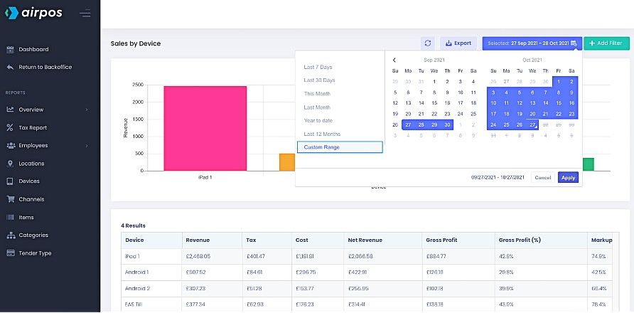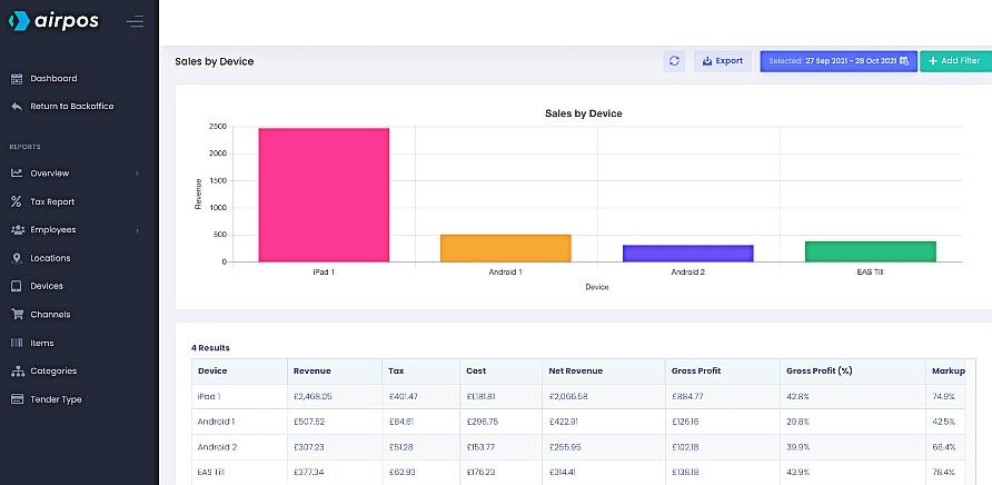 Directly below all the sales data relevant to each device will be presented in tabular format which can be exported to a .CSV file by pressing the green ‘Export’ button at the top of the screen. The data will include the total revenue generated by each device, the total tax, cost, and the net revenue. The gross margin and profit margin as a percentage also will be calculated and exposed in this table.