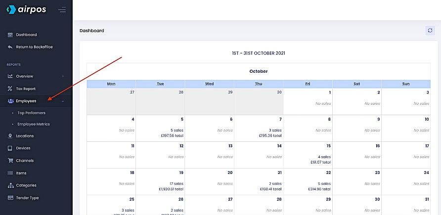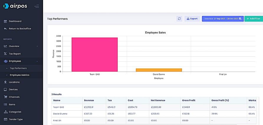 In the reports section when you select employees you will be offered two options; Top Performers and Employee Metrics. The top performers chart is a graphical view showing the sales performance of each of your employees. If you hover the pointer over each staff members bar the total figure for their sales within the specified date range will be displayed.