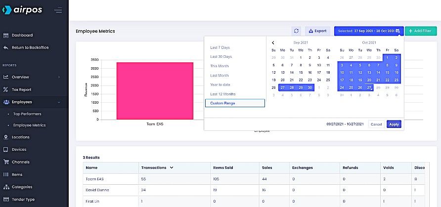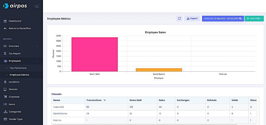Under employees as well as top performers is a report on ‘Employee Metrics’. The chart shows the total sales for each member of staff within the date range shown at the top of the screen. The table below it gives a range of useful data such as the total number of transactions performed by each member of staff, the total number of items sold, the number of exchanges, refunds, voids and discounts.