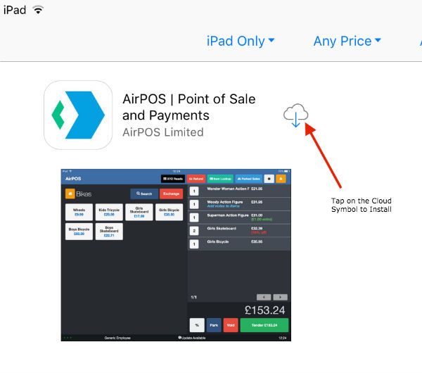Lastly tap on the install app icon (the small cloud), and AirPOS will begin downloading to your device.