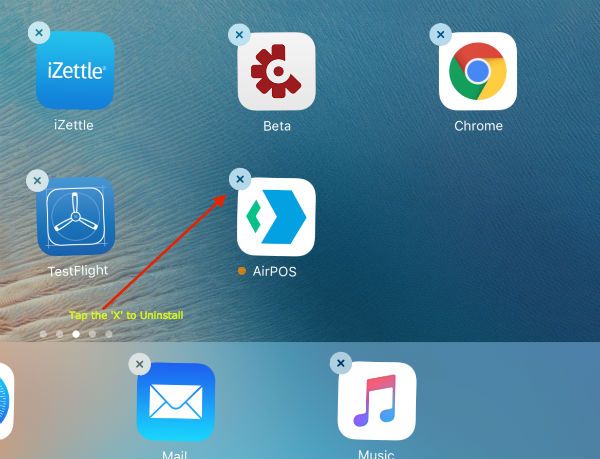 To uninstall AirPOS (or any app from your iPad) hold your finger on the AirPOS app icon until it 'wobbles'. You'll see a small 'X' in the top left corner of the icon. Tap on that to remove AirPOS from your device.