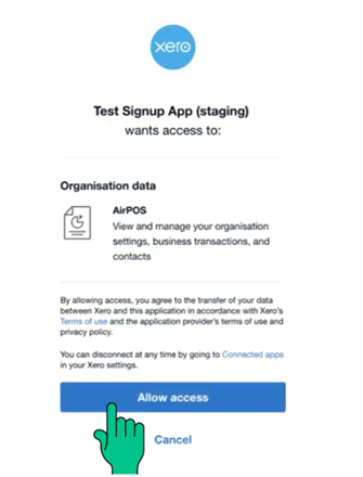 Simply log into your Xero account from the window that appears to start this process. Once logged in, you'll receive a request for Xero to access your AirPOS data. Click 'Allow Access' to move on to the next step.