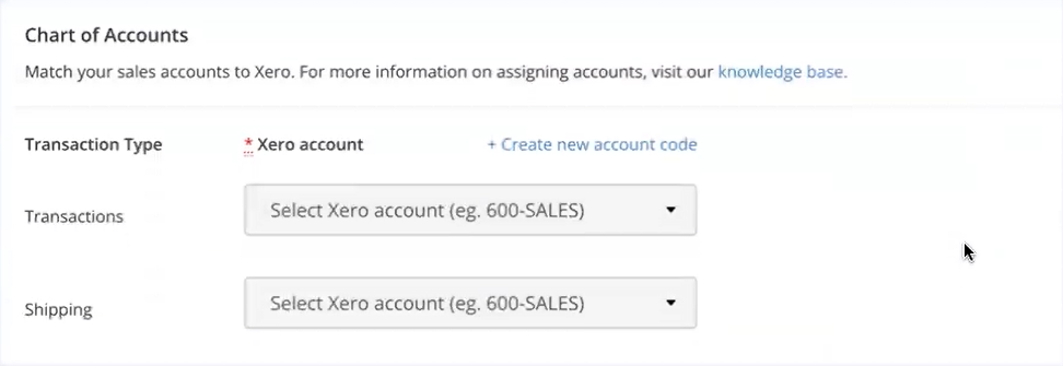 This section deals with matching your sales accounts to Xero using our convenient drop-down boxes. Select the appropriate Xero account codes for both 'Transactions' and our new 'Shipping' tender types to proceed.