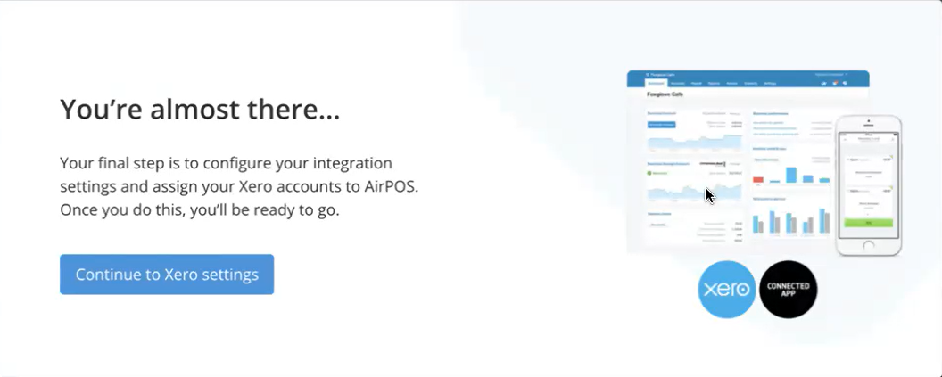 After granting AirPOS access to your Xero account, the next step is to set up your 'Xero Settings.' Click 'Continue to Xero Settings' to begin this process.