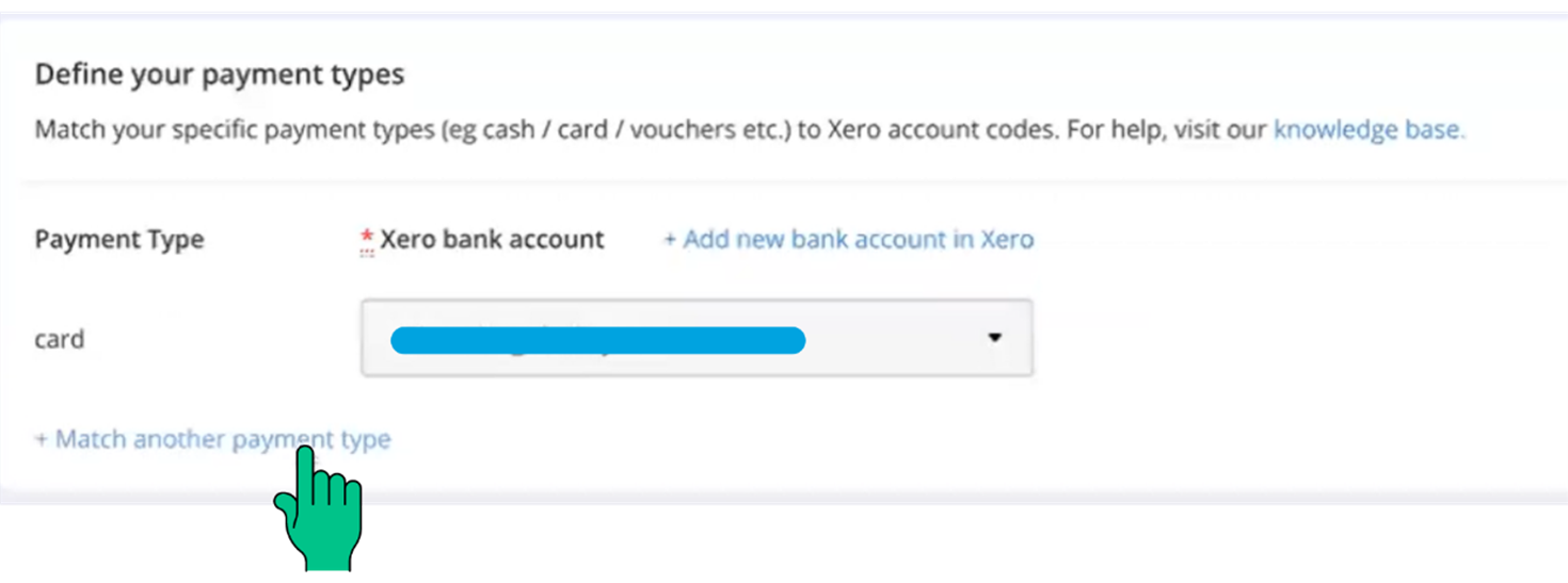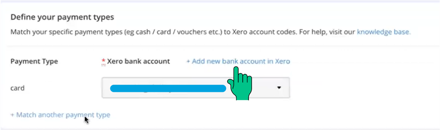 You'll be presented with two options: 'Payment type' and 'Xero bank account.' Simply choose the payment type you use in your business from the drop-down list and match it with the desired bank account that has been set up in Xero. Once correctly matched, click 'Add' to complete this step.
