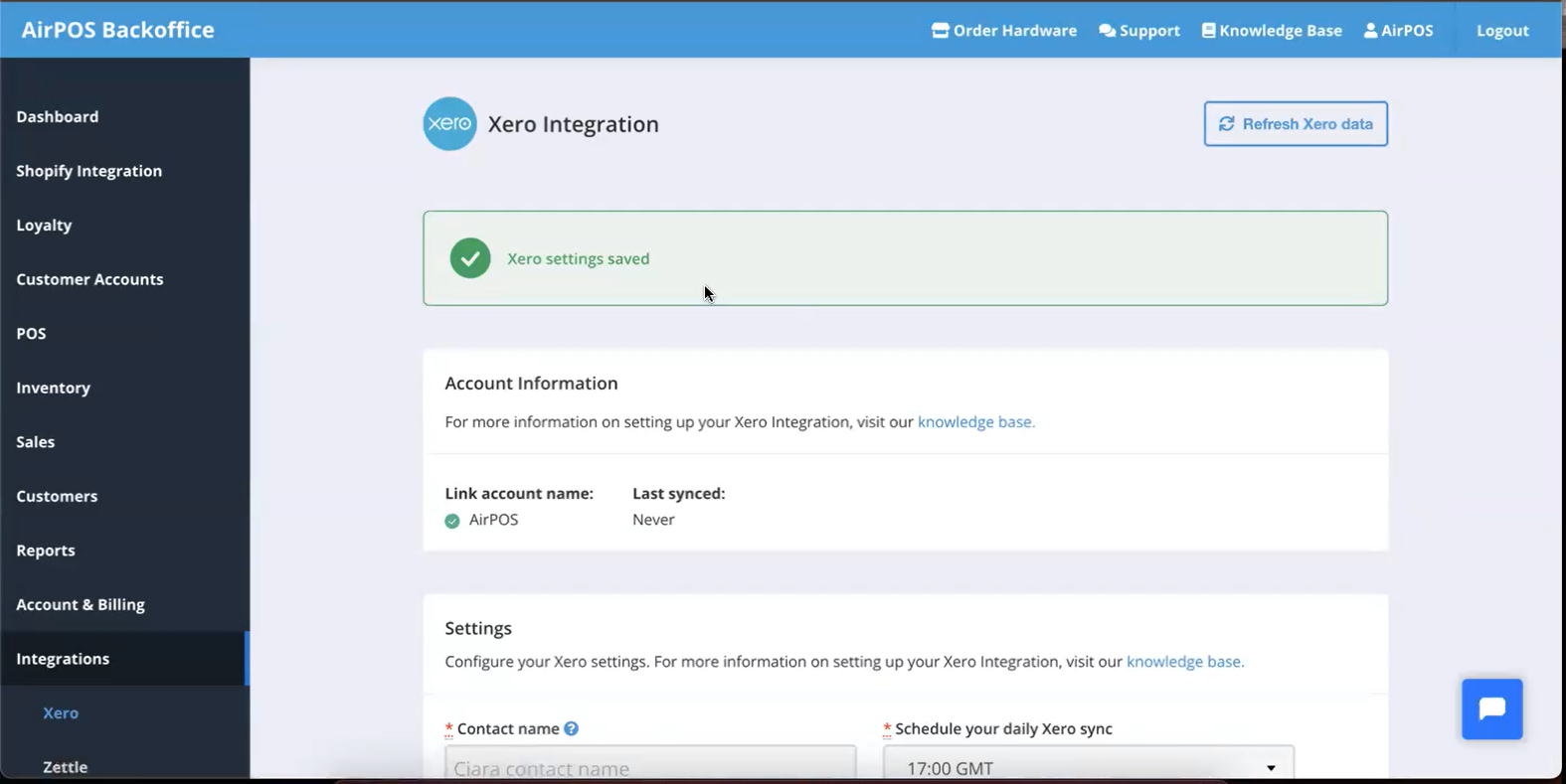 If you have any questions or require assistance with your Xero integration, please don't hesitate to contact us. You can reach our support chat by clicking on the small blue box located in the bottom right corner of your screen.