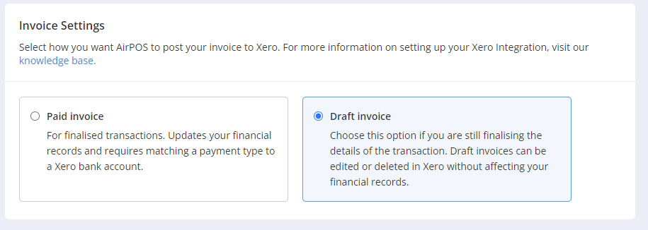 We offer two straightforward options for sending your invoices to your Xero account: "Paid" or "Draft."