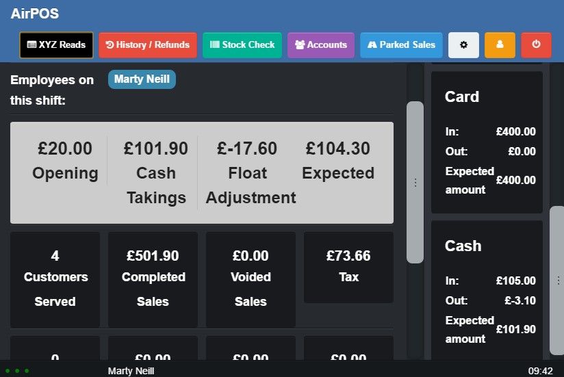 Throughout the day you may want to keep an eye on your till takings or perform an ‘X’ read. To do this simply click the ‘XYZ’ located in the top navigation bar. When clicked, the following Screen will appear. It will show all sales by cash, card and all tender types that you use. It will report the number of transactions, the value of voided sales and the value of any refunds