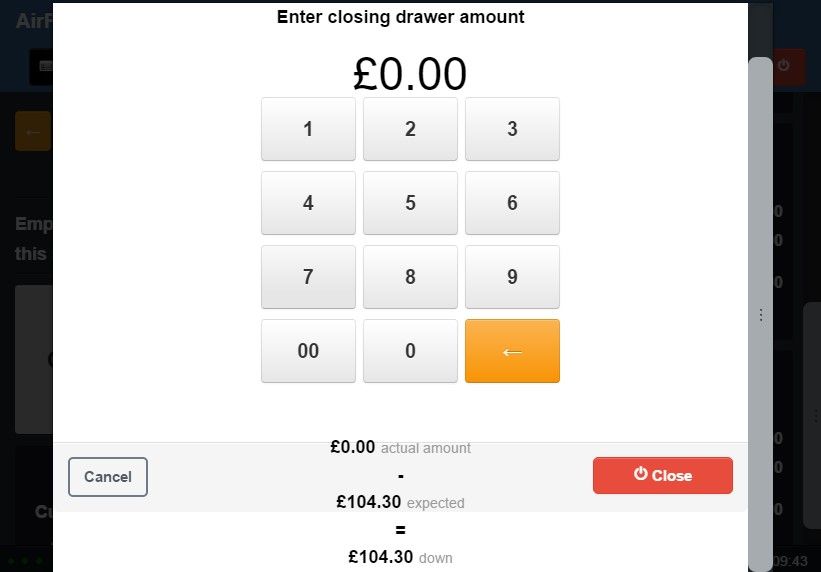Z-Reads are generally performed at the end of each day. These provide a breakdown of tender types and transaction totals that have been performed on AirPOS, along with an expected cash amount that should be present in the drawer based on the cash takings plus the opening drawer amount. To carry out a ‘Z’ Read, when in the XYZ page, simply click ‘close drawer for end of day’ and enter your closing drawer amount, which is the amount of cash physically in the till.