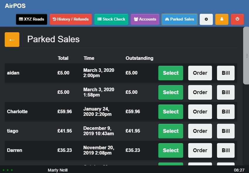 Click the ‘parked sales’ button in the top navigation on your sales screen and a list of your parked sales should appear as below;