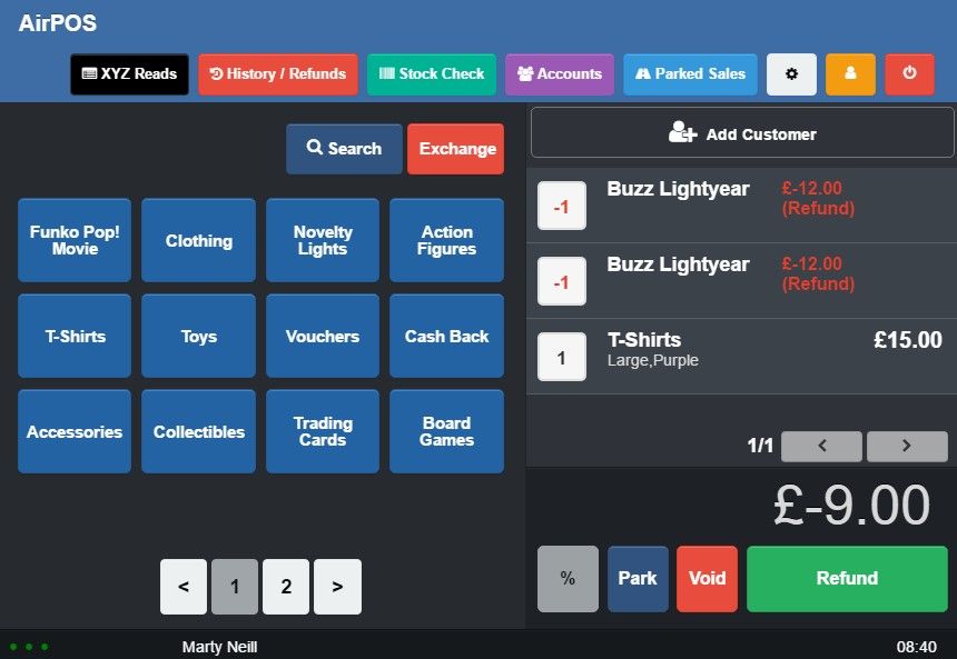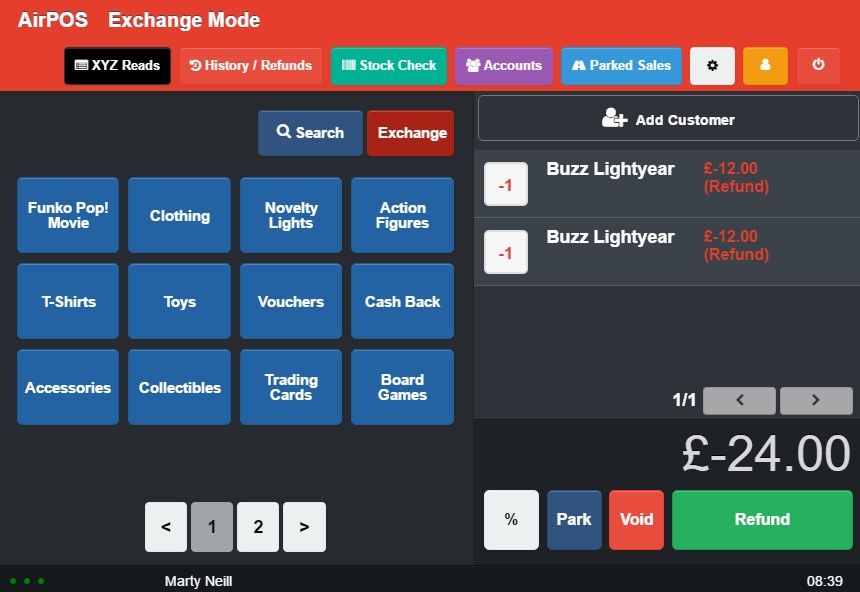 By enabling ‘Exchange Mode’ on AirPOS, you can combine returned items (with negative values) and items for sale (with positive values) in the same transaction giving you a simple and seamless way to refund an item or exchange it for another.