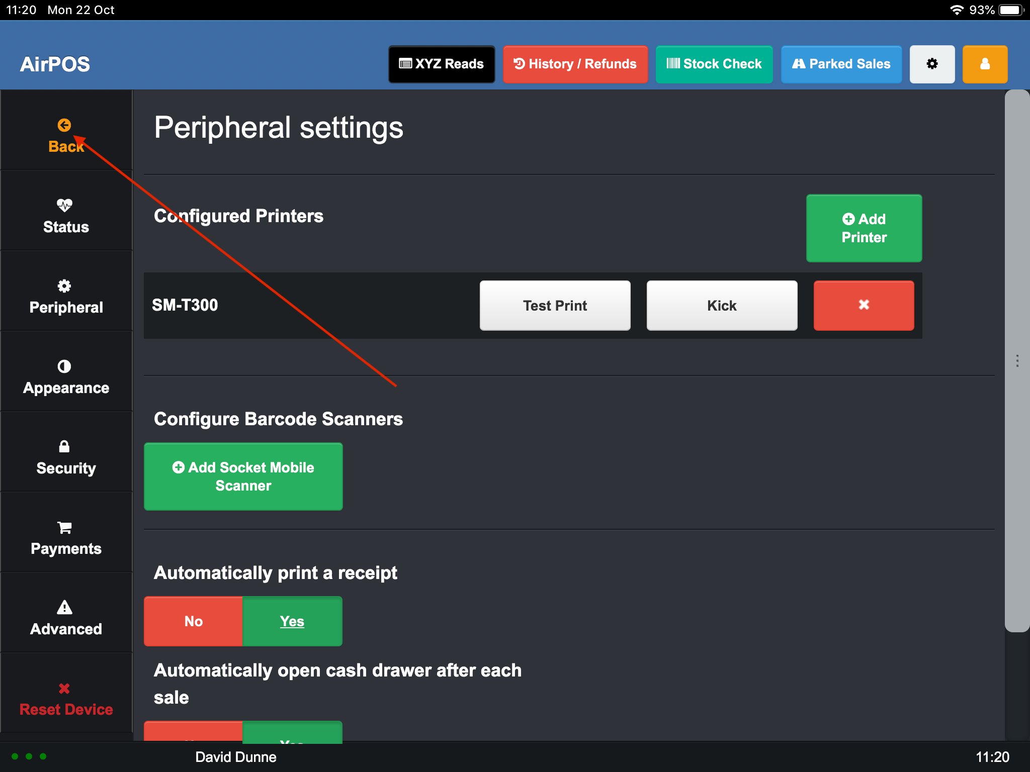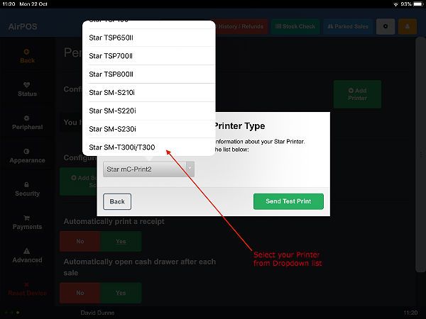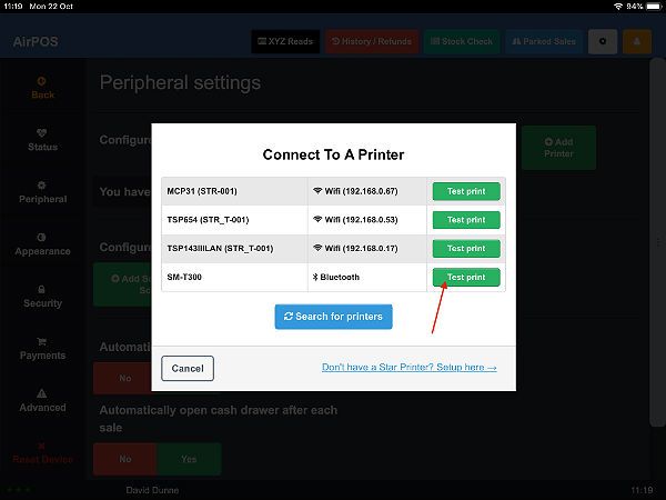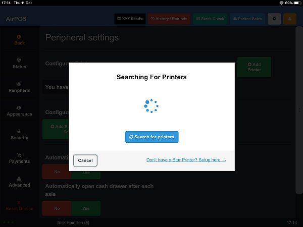 Open the AirPOS POS application on your iPad and open settings by pressing the cogwheel icon at the top right of the screen. Select ‘Peripherals’ from the left hand panel and press the green ‘Add Printer’ button. AirPOS will immediately start looking for available printers.