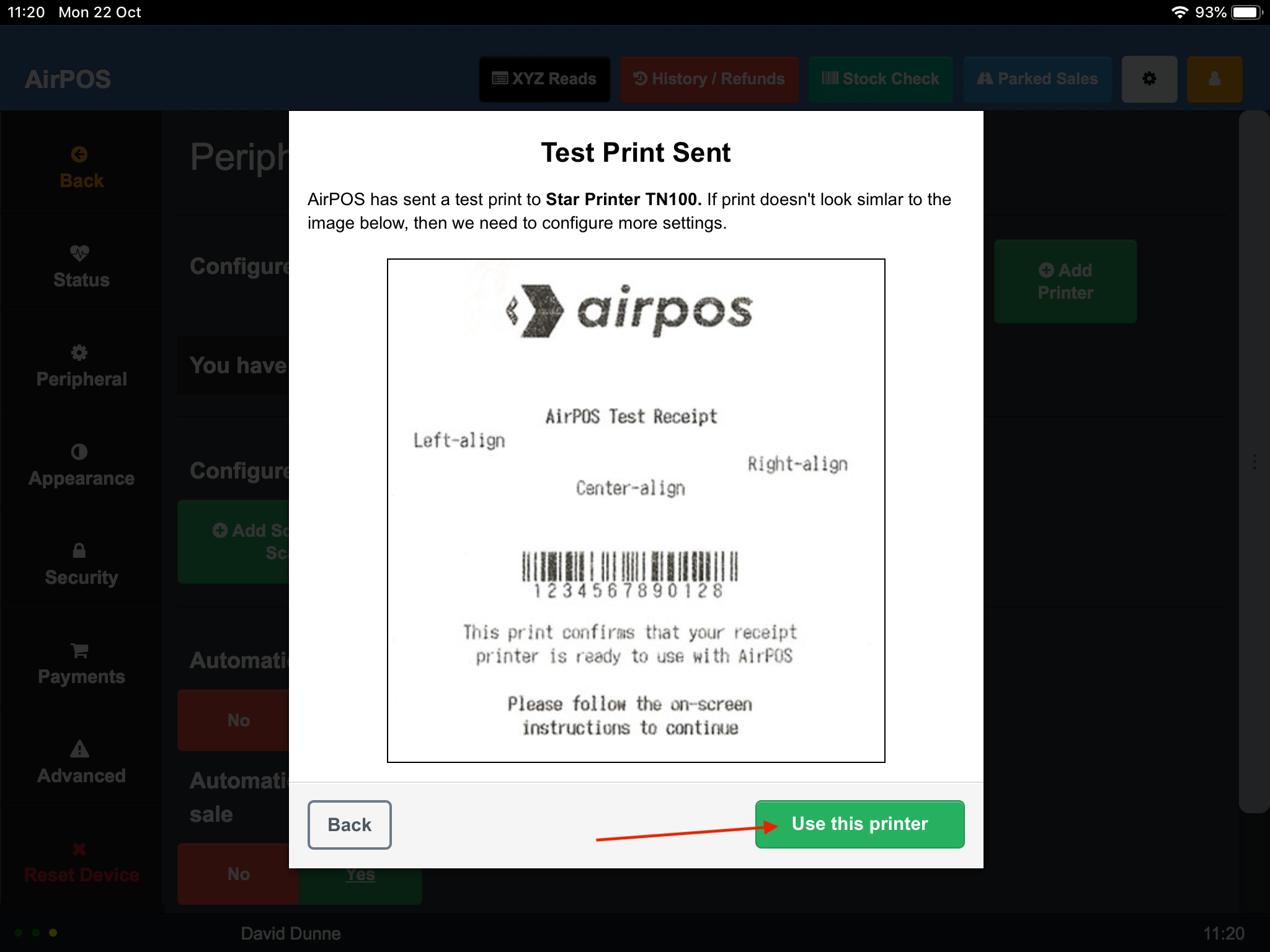 Tap on the green 'Use this printer' button and that's your Bluetooth printer configured for AirPOS on your iPad.