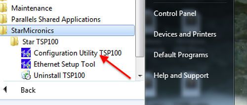 Having installed the driver and software for the TSP100, from the Start menu in Windows click in ‘All Programs’ > Star Micronics > TSP100 > Configuration Utility TSP100 as shown here.