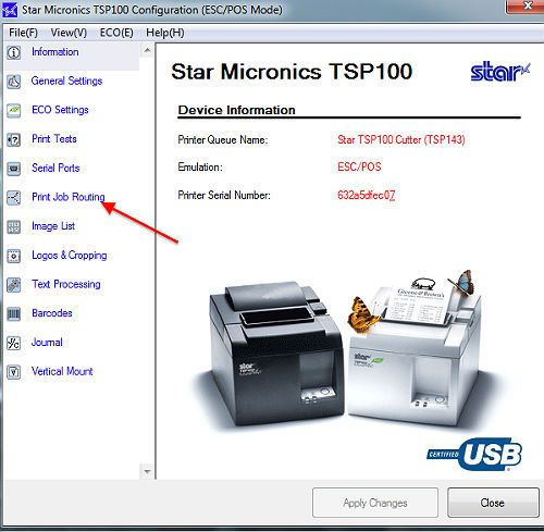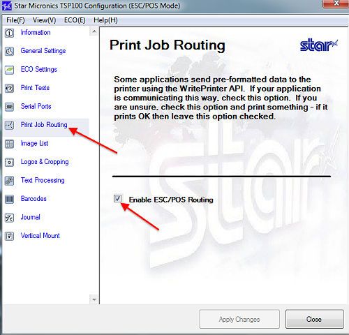 A new screen will appear. Ensure that the box at Enable ESC/POS Routing is ticked as seen here. If the box is left unchecked, some applications may use ‘Star Line Mode parsing’, resulting in corrupted printing.