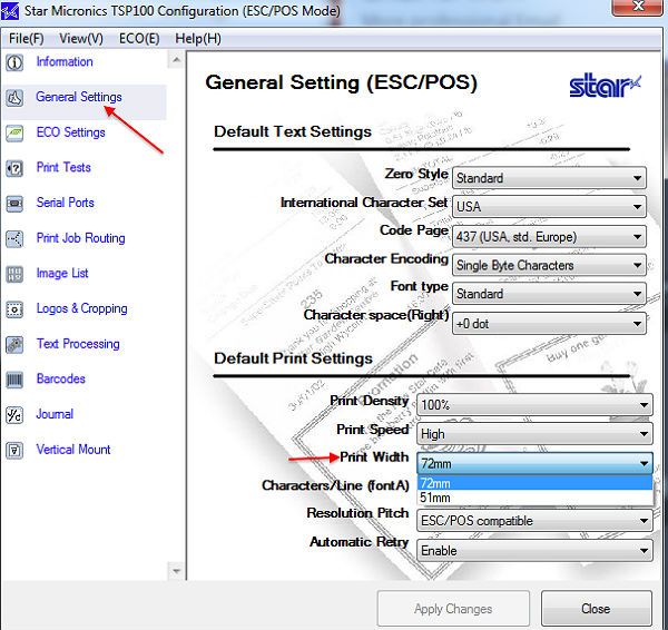While in the Configuration Utility Click on General Settings near the top left of the screen. When the general settings screen opens click in the drop down box beside Print Width and ensure 72mm is selected.