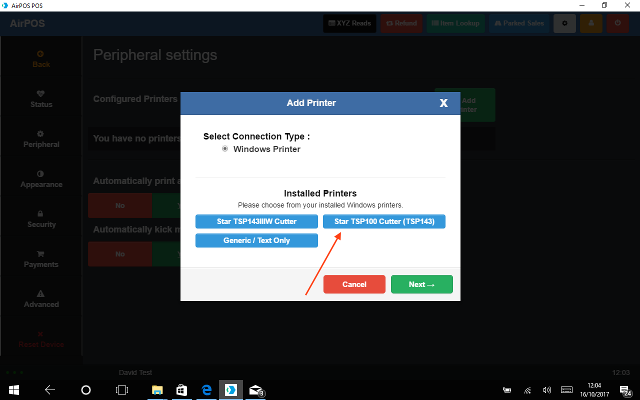 Your printer is now setup on your Windows machine and it remains only to configure it on AirPOS. Open the AirPOS application and click or tap on the settings cogwheel at the top of the screen. From the left margin select 'Peripherals'. When you press the green 'Add Printer' button a popup will appear showing all printers setup on your Windows machine. Click on the printer you wish to add and press the 'Next' button as seen below.