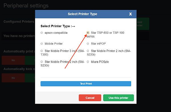A new popup in which you select the printer type will appear. Select the "Star TSP650 or TSP - 100 series" option and then press the 'Use this printer' button to save your settings.