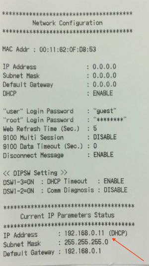 Connect the printer to the mains power. Using an Ethernet cable connect the printer to your router. While holding down the 'FEED' button turn theprinter on using the switch on the left hand side of the printer. It will self print it's settings, pause with the lights flashing while it acquires a connection then print out it's IP Address. The bottom of the self print should look like this.