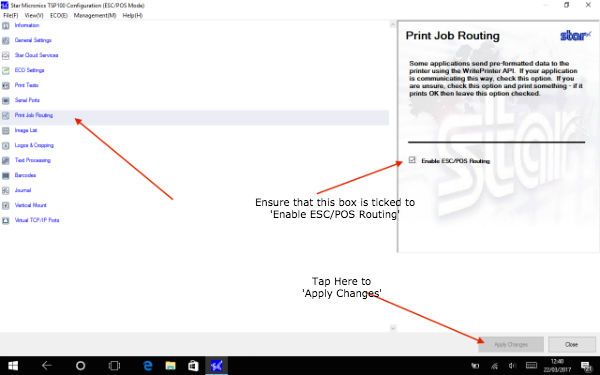 Click in the box beside 'Enable ESC/POS Routing' and press the 'Apply Changes' button.