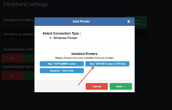 Your printer is now setup on your Windows machine and it remains only to configure it on AirPOS. Open the AirPOS application and click or tap on the settings cogwheel at the top of the screen. From the left margin select 'Peripherals'. When you press the 'Add Printer' button any printers setup on your Windows machine will be displayed in a blue box (you may see your office printer or other printers added on Windows listed). Tap on the printer you've just added and press 'Next'.