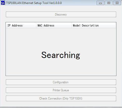 Having downloaded the TSP100 III Utility go to your Windows Start menu and open the Application 'Configuration Utility TSP100'. You may receive a popup to say 'No USB printers detected Click ok to proceed to install LAN printer'. Click OK and the popup will change as it searches for connected printers.
