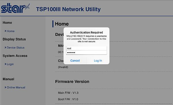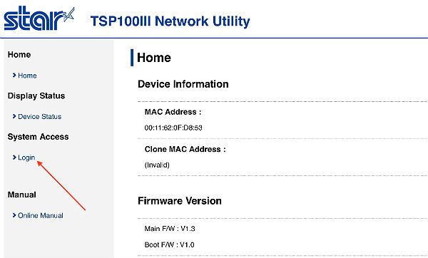 At this point your Windows machine is connected to your printer and can now be configured on AirPOS or you can assign a static IP Address to the printer with a couple of clicks. To do this from the left panel of the Web Configuration Utility screen tap on 'Login'.