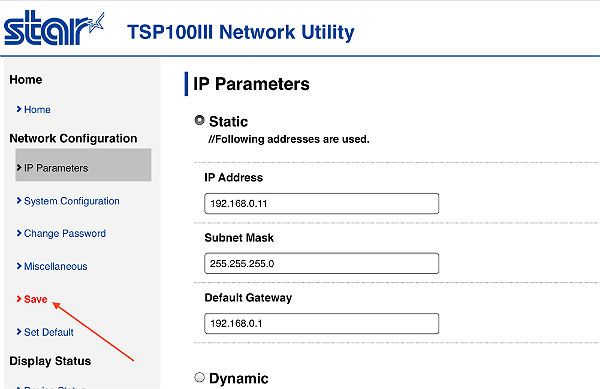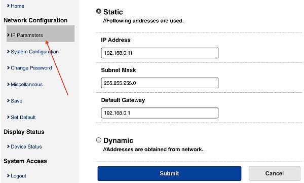 Now tap on 'IP Parameters' from the left of the refreshed screen and tap on 'Static' as shown below. Type the IP Address that you want to use. You should use the IP Parameters you got from the self print as you know that the IP Address would not have been assigned if there was a conflict with another device on your network. When you've entered the IP Address, Subnet Mask and Default Gateway tap 'Submit' as shown below.
