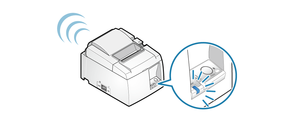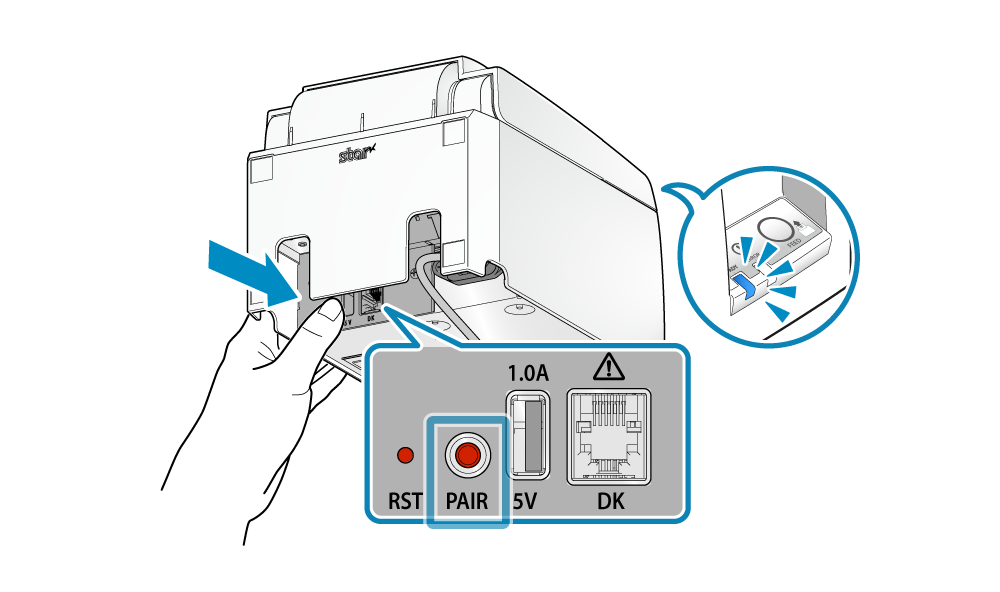 - Press and hold the PAIR button until the LED (blue) button of the printer blinks (see diagram below).