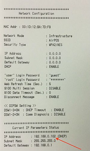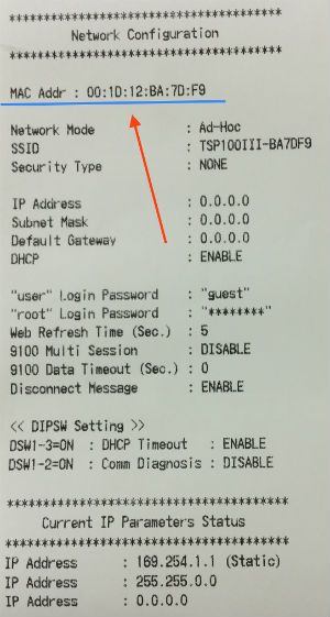 You'll need to obtain the Mac address of the printer. This is printed at the top of a self print from the printer which you can get by switching the printer off and waiting for all the lights to go off. Next, while holding down the feed button turn the printer on again. It will self print with the Mac Address and IP Address as seen below.