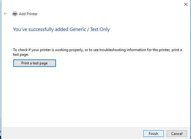 The new window will prompt you for a printer name. If you're happy with 'Generic/Text Only' press the finish button.