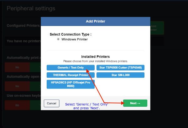 The next step is to configure the printer on AIrPOS. Open the AirPOS peripheral settings by clicking on the settings cogwheel icon at the top tight of the POS screen and selecting 'Peripherals' from the menu in the left panel. Press the green 'Add Printer' button and a window like that below will appear in which all printers connected to your Windows machine will be shown.