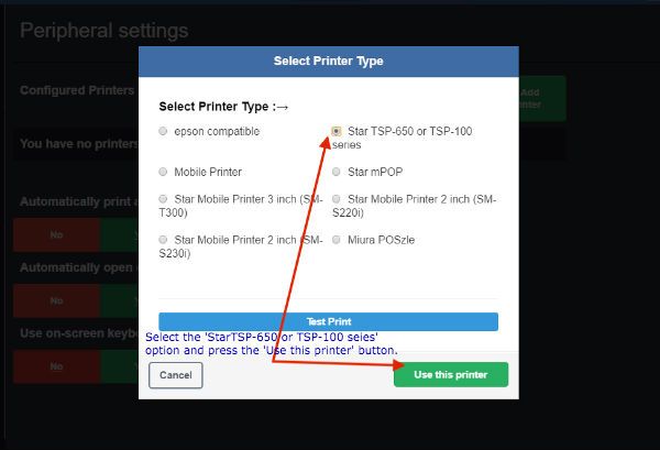The printer type popup will appear in which you'll select the printer type. The printer type is 'Star TSP-650 or TSP - 100 series'. Select this option then press the green 'Use this printer' button to save your selections.