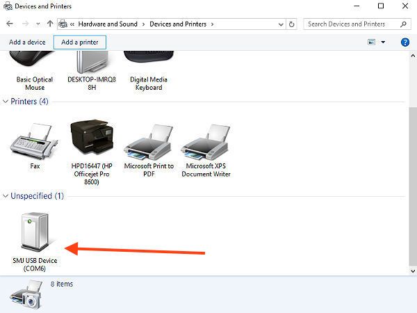 Go to your Windows Control Panel and open Devices and Printers. When you plug the printer in and switch it on the device will be reported as unspecified and will report the COM port number as shown below.