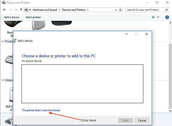 Press the 'Add a printer' button at the top of the above window and Windows will start searching for printers. It may show other printers such as your office printer but may find none. When it has finished searching click on the link "The printer I want isn't listed" and press the next button as seen below.