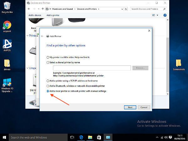 A new popup will appear to 'Find a printer by other options'. In that window select the option to "add a local printer or network printer with manual settings" and press the next button as seen here.