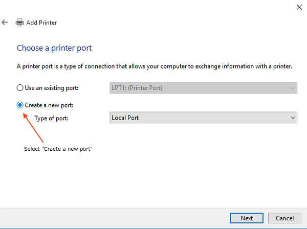 A new window will open to "Choose a printer port". Click on the option to "Create a new port" and press the next button as seen below.