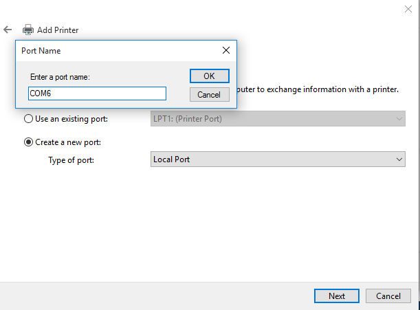 A new window will open in which you name the port. Name it COMx where 'x' is the number of the port reported for the unspecified device you saw appear when you connected the printer and turned it on (in this case COM6). Press the next button. See below.