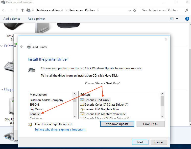 A new window will open where you can search for printers by manufacturer and model. Select "Generic" under manufacturer and "Generic/Text Only" under printers and press the next button as shown here. You can also select 'Star' as the manufacturer and search for the 'Star TSP650II Cutter' under printer.