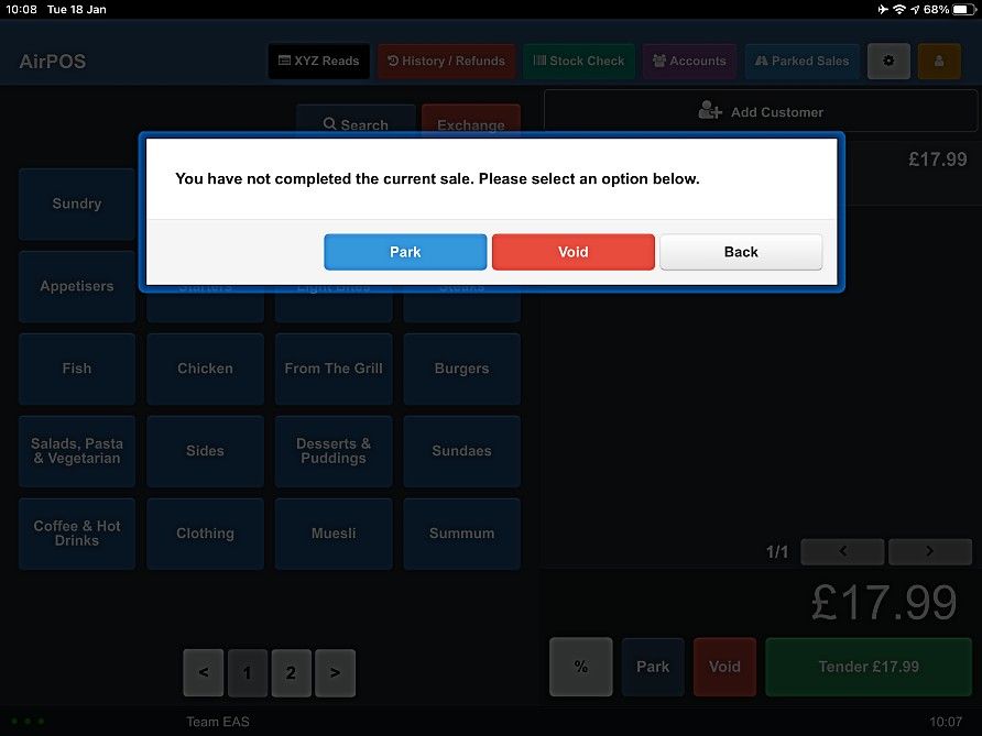 If you press the void button the transaction will be lost. If you press 'Park' a popup will appear in which you name the transaction. Once you've parked any open sales the screen will revert to the login screen. Tap on the name of the user you want to login as.