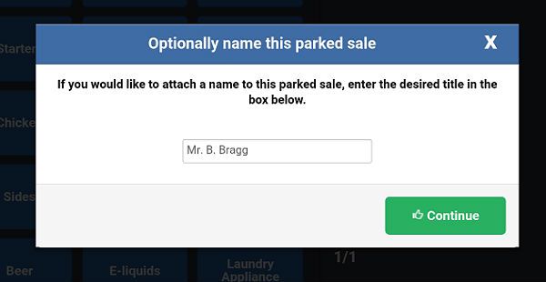 On occasion you may wish to take a partial payment for goods allowing your customer to return at a later point to pay the balance and complete the transaction. To do this, when the cart is filled, tap on the blue 'Park' button at the bottom of the cart. A small popup will appear prompting you to optionally name the parked sale. You'll probably want to give it the name of your customer.
