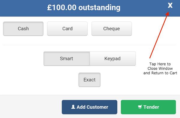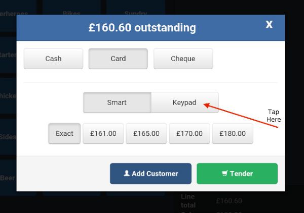 Press the continue button and the screen will clear. At the top of the screen tap on the 'Parked Sales' button and all your parked sales will be listed with the most recent at the top. Unpark the sale by pressing the 'Unpark' button beside it and it will appear again in the cart. Tap the tender button, select your tender type (cash, card etc.) and then tap on the 'Keypad' button as shown below.