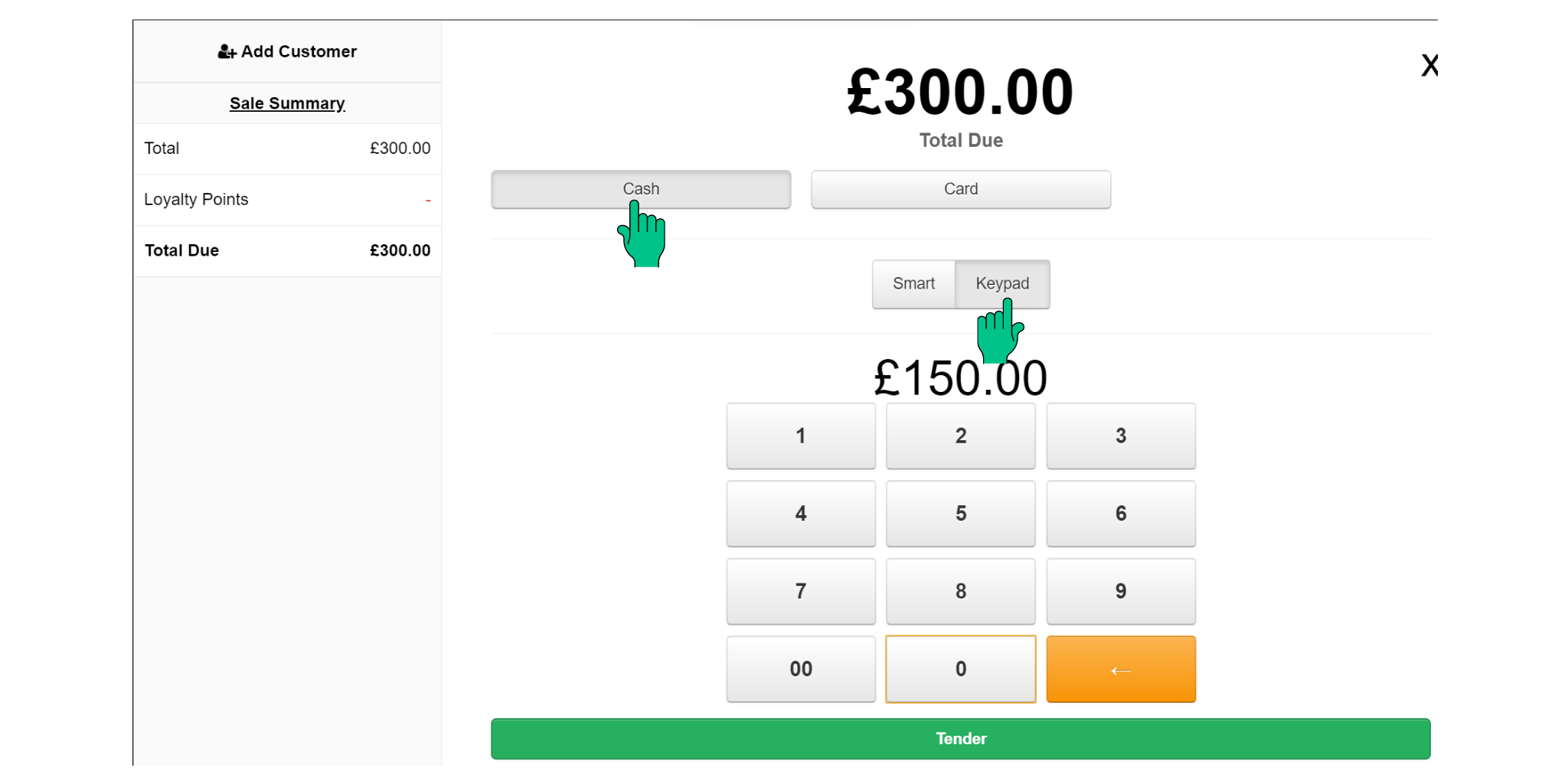 You can do this for multiple payment types. For example If you want to take a £10 voucher towards the payment select 'Voucher' as the tender type and then, using the Keypad, enter the value of the voucher as 10.00 and press tender. The outstanding amount is shown and you can take multiple payments in this manner for different tender types or customers until the transaction is complete.