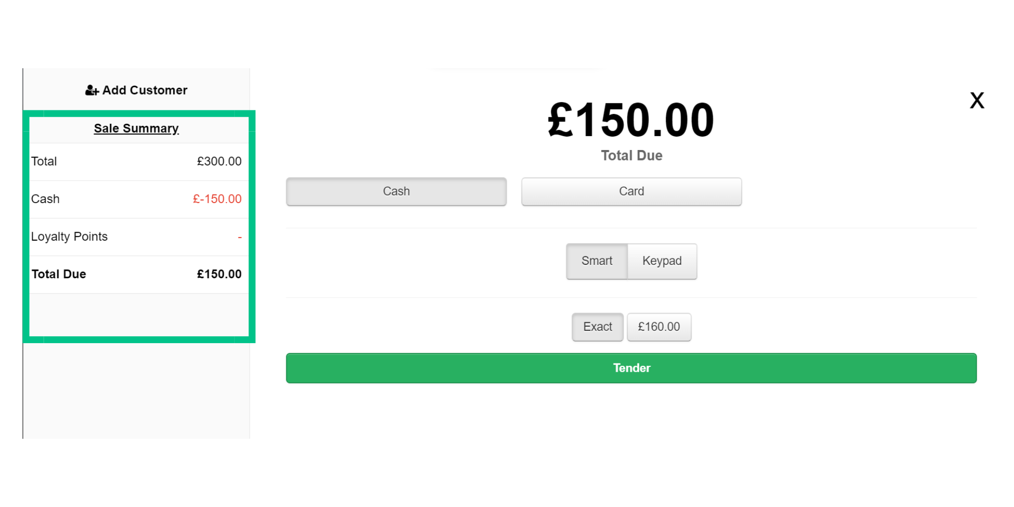 When you press the tender button the screen window will change and the outstanding amount will be displayed.