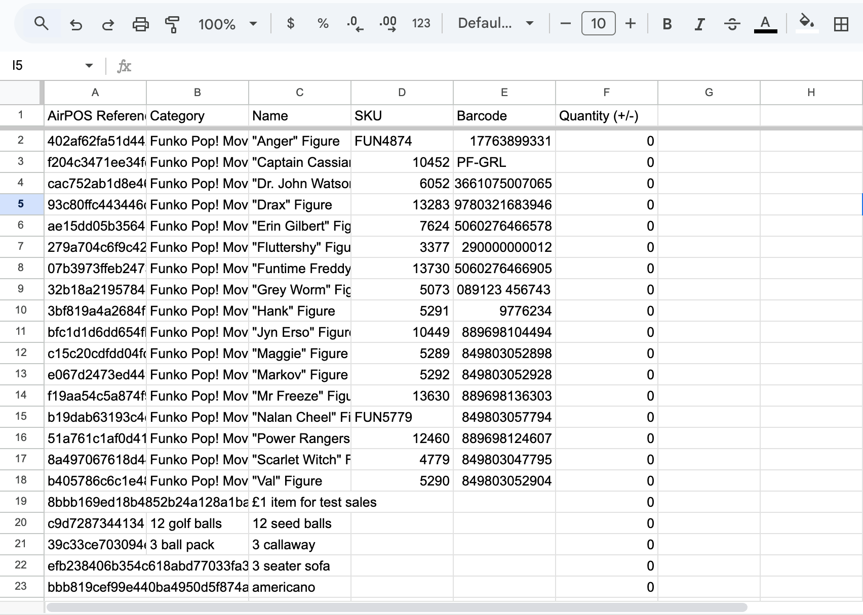 The template, when opened in a spreadsheet has six columns. The first is the unique AirPOS Reference, generated for each item in your product list. The next columns are the item's category, name, SKU, Barcode and a final column for Quantity +/-.