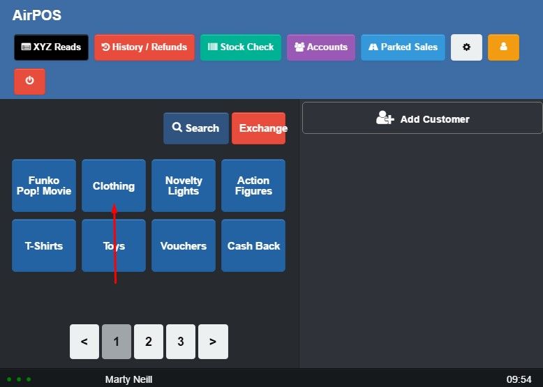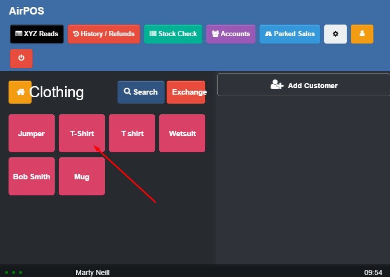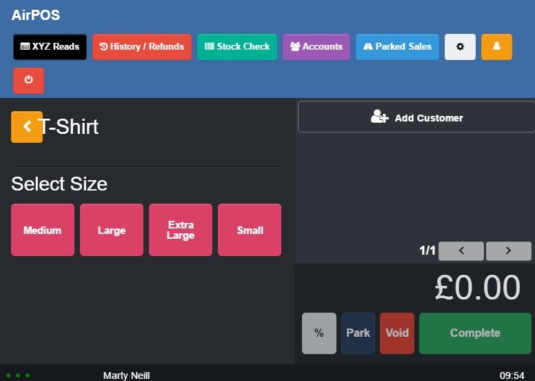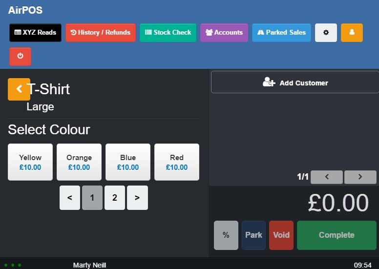 On the POS your products with variants will behave very much like you would have seen when using sub-categories for variants. In our example we've created a product called 'T-Shirt' with variants in size and colour and assigned it to a category called 'Merchandise' which is intended just for products with variants (a product with variants can be assigned to any category).