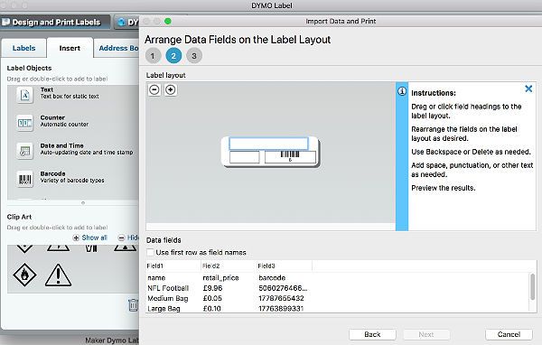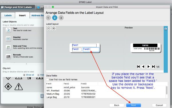 In the next screen below you can arrange the data fields on your label by clicking in the data field of the label and then clicking on the field name of the input file below in order.