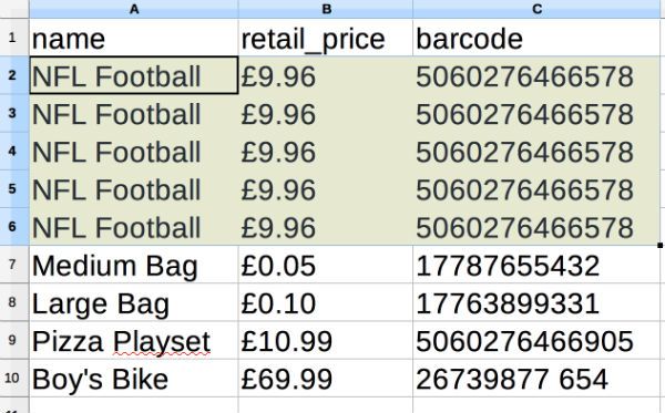 If you want multiple labels for the same product then to achieve that you'll need to enter the same data in the input file for the same number of times as the number of labels you need. Using the same 'new_labels' file as above, for example, if five labels were needed for the 'NFL Football' product you would have the same entry in the file for the 'NFL Football' five times. If you insert four empty lines below the 'NFL Football' listing you can replicate the text cells in a column.
