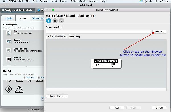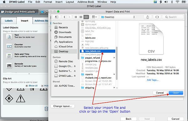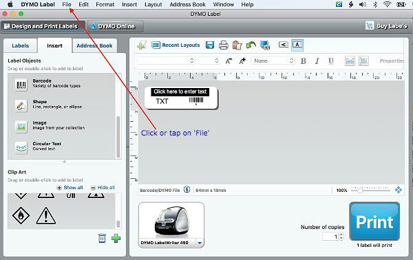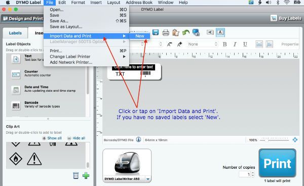 We've created a file and called it 'new_labels.csv'. When you open the Dymo software for the first time you can import a file for your labels using the default label layout or you can create your own label template. For now we'll use the default. When you open the Dymo app you'll see something like the image below.