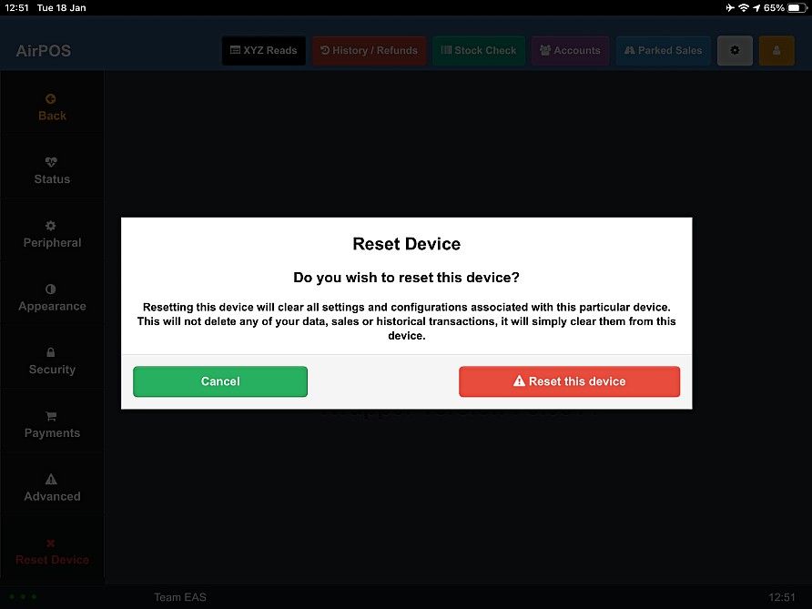 The ‘Reset’ button provides you with the ability to reset your current device safely from AirPOS. To do this simply click ‘reset device’ and the following modal window will give you the option to do so;